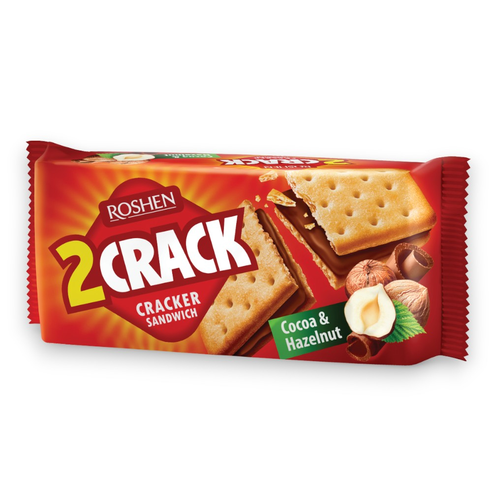 Cracker 2 CRACK cu umplutură de alune și cacao este o combinație clasică de cracker delicat și fin cu cremă de alune și cacao.