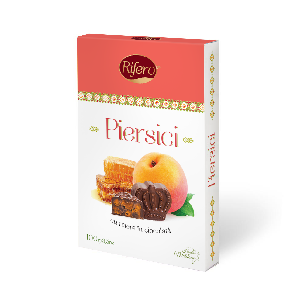 Piersici uscați, ciocolată neagră (masă de cacao, zahăr, unt de cacao, emulgator (lecitina din soia-E322), aroma naturală (vanilia). Substanța totală de cacao în ciocolată min. 55%. Ciocolata nu conține alte grăsimi vegetale decât untul de cacao. ATENȚIE: Produsul poate conține urme de fructe cu coajă lemnoasă. Poate conține urme de alte nuci. Avertizare alergeni: soia. Condiții de păstrare: a se păstra la loc uscat și răcoros, ferit de lumina directă a soarelui. Regimul de temperatură (18±3)ºC. Umeditatea aerului max.75%. La producerea bomboanelor se utilizează doar ingrediente naturale, fără conservanți sau alte adaosuri. Atât producerea cât și ambalarea bomboanelor Rifero se face manual. Bomboane realizate manual, cu umplutură de piersici aromate și ciocolată naturală. Făcute doar ingredientele naturale, atent selecționate, piersicile în ciocolată sunt un desert dulce-acrișor, cu nuanțe amărui, delicioase.